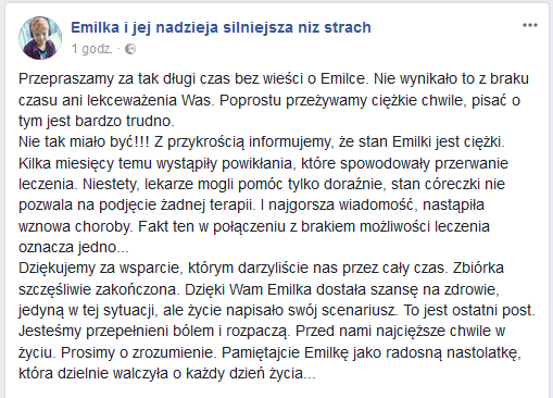 Nie tak miało być... Niestety, Emilka Jasic z Oleszyc przegrywa z chorobą. Poinformowała o tym poprzez Facebooka rodzina dziewczynki.