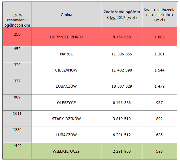 Jak wynika z tych danych, największy dług w odniesieniu do liczby mieszkańców zaciągnęła gmina Horyniec-Zdrój. Na jednego mieszkańca tej gminy przypada prawie 1,7 tys. zł należności. W zestawieniu ogólnopolskim na 2478 gmin, Horyniec-Zdrój zajmuje 258 miejsce.