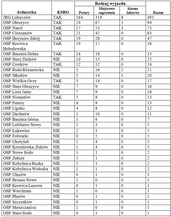 Najaktywniejszą ochotniczą jednostką wśród ochotników była OSP Oleszyce. Druhowie tej jednostki zaliczyli 94 wyjazdów. O 21 zdarzeń mniej odnotowała Ochotnicza Straż Pożarna z Narola, natomiast 63 razy do akcji ruszali strażacy OSP Cieszanów. Zawodowi ratownicy uczestniczyli w 491 akcjach.
