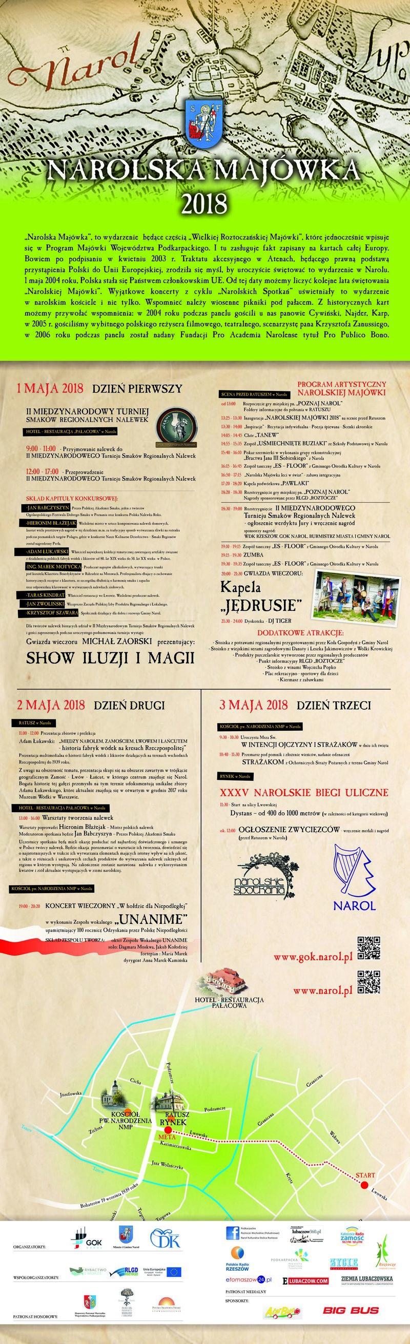 „Narolska Majówka” stanowi część „Wielkiej Roztoczańskiej Majówki” wpisując się w program Majówki Województwa Podkarpackiego. Będzie to wyjątkowe trzydniowe wydarzenie, w trakcie którego odbędzie się VI TURNIEJ SMAKÓW REGIONALNYCH NALEWEK , a II MIĘDZYNARODOWY oraz warsztaty tworzenia nalewek. Gwiazdą wieczoru będzie Kapela „Jędrusie”, wystąpią również chór Tanew oraz „Pawlaki”. Będzie również niepowtarzalna okazja by poznać Narol poprzez zabawę uczestnicząc w grze miejskiej. Organizatorzy przygotowali również stoiska z potrawami regionalnymi Koła Gospodyń, wiejskimi serami zagrodowymi, produktami pszczelarskimi, kiermasz z zabawkami, placyk rekreacyjny dla dzieci. W dniu 2 maja odbędzie się koncert w wykonaniu UNANIME pt. „W hołdzie Niepodległej”. Natomiast w dniu Święta Konstytucji oprócz uroczystości będzie można uczestniczyć w XXXV Narolskich Biegach Ulicznych.