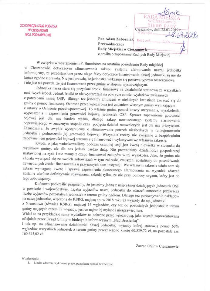 Jak czytamy na fanpage OSP w Cieszanowie na sesji Rady Miejskiej, która odbyła się 28 lutego Zdzisław Zadworny zarzucił strażakom, iż oczekują oni wszystkiego od gminy, a nic nie dają od siebie. Oburzeni tymi słowami ochotnicy wystosowali pismo do Przewodniczącego Rady, w którym podkreślają, że jednostka nie wykazuje się postawą roszczeniową. Zaznaczyli również, że finansowanie przez gminę jest niewystarczające, a każda prośba dofinansowania umotywowana jak najskuteczniejszym udzielaniem pomocy mieszkańcom gminy. Treść pisma poniżej: