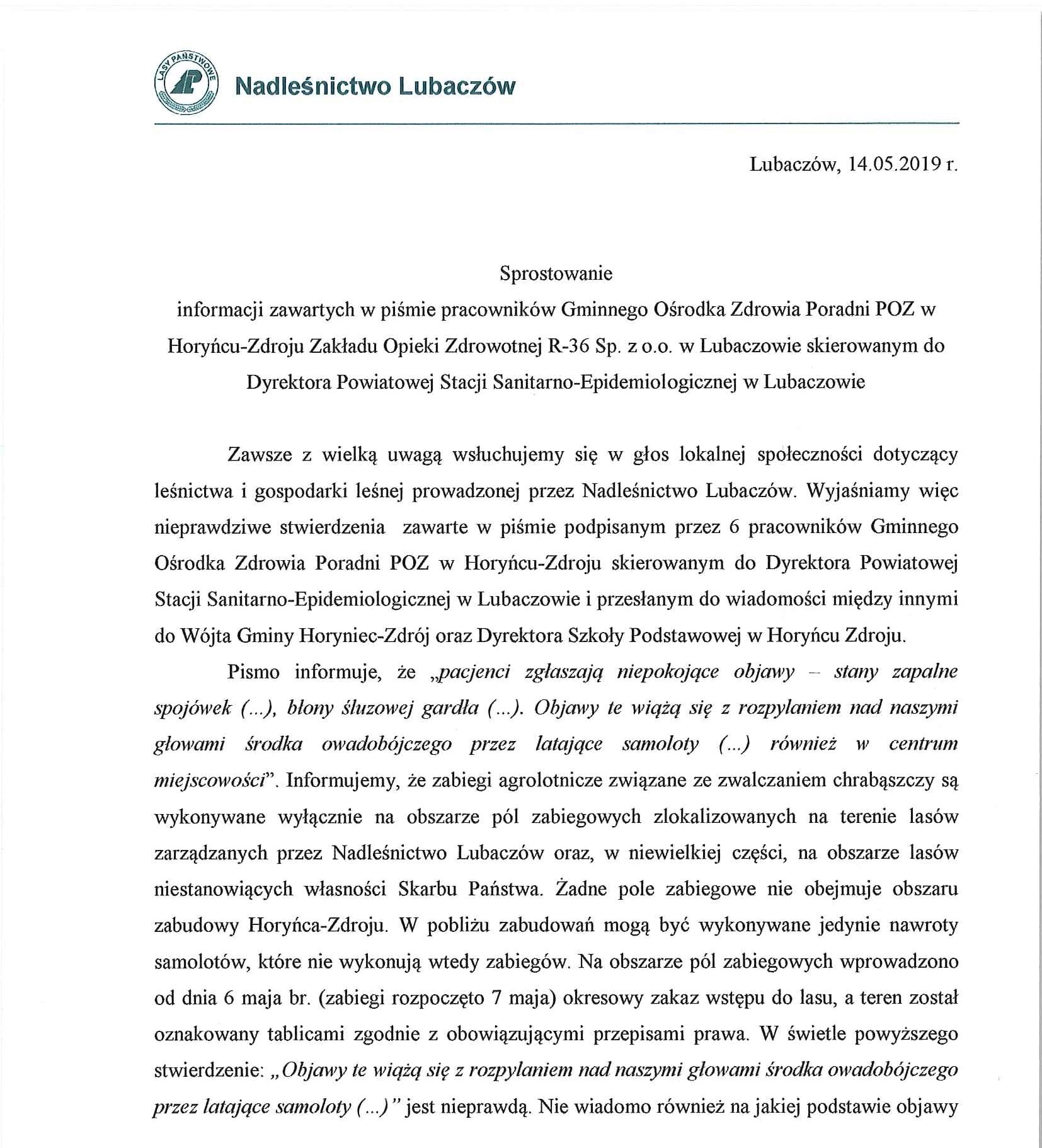 Nadleśniczy Nadleśnictwa Lubaczów Robert Banaś wystosował komunikat w sprawie prowadzonych zabiegów agrolotniczych, w którym zaprzecza jakoby leśnicy narazili na kontakt ze stosowanym w zabiegach środkiem Mosipilan 20 SP mieszkańców Horyńca-Zdroju i okolicznych miejscowości.