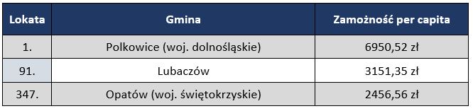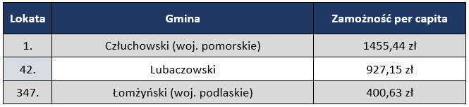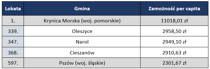 Od kilkunastu lat magazyn „Wspólnota” przygotowuje rankingi finansowe, m.in. dotyczące wydatków na inwestycje i poziomu zamożności w przeliczeniu na jednego mieszkańca. Dochody poszczególnych samorządów w roku 2018, podobnie jak w latach wcześniejszych, zostały podzielone przez liczbę mieszkańców gminy.