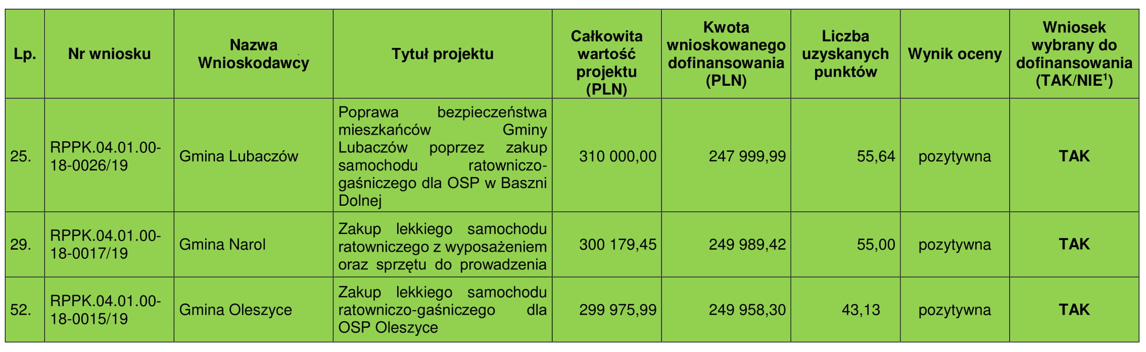 Pierwotnie wsparcie finansowe miały uzyskać tylko 33 projekty, jednakże w związku z przeniesieniem środków z innego programu Zarząd Województwa wybrał dodatkowo 32 projekty z listy rezerwowej. To oznacza, że oprócz strażaków z Narola i Baszni Dolnej nowy samochód dostaną także ratownicy z Oleszyc.