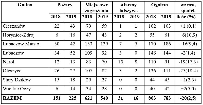 W 2019 roku na terenie powiatu lubaczowskiego straż pożarna odnotowała 783 zdarzeń. To o 20 mniej niż w 2018 roku. W zdecydowanej większości były to tzw. miejscowe zagrożenia, czyli wyjazdy do zdarzeń drogowych oraz np. zwalczanie skutków wichur i lokalnych podtopień. Łącznie w minionym roku na terenie powiatu odnotowano 540 zagrożeń miejscowych, 225 pożarów (tutaj wzrost w stosunku do ubiegłego roku aż o 74) i 18 alarmów fałszywych.