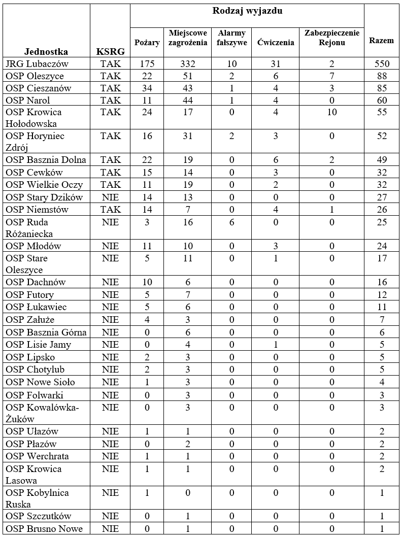 Najaktywniejszą ochotniczą jednostką wśród ochotników była OSP Oleszyce. Druhowie tej jednostki zaliczyli 88 wyjazdów. O 3 zdarzenia mniej odnotowała Ochotnicza Straż Pożarna z Cieszanowa, natomiast 60 razy do akcji ruszali strażacy OSP Narol.