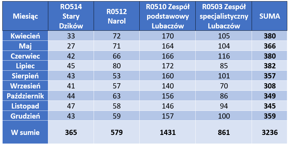 Od kwietnia do grudnia 2019 roku w sumie ratownicy odnotowali 3236 wyjazdów. Do pomocy najczęściej wyjeżdżał zespół podstawowy stacjonujący w Lubaczowie (1431). 861 razy w akcji uczestniczył zespół specjalistyczny (z lekarzem w składzie). Ratownicy zabezpieczający Narol i okolice udzielali pomocy 579 razy. Natomiast karetka znajdująca się w Starym Dzikowie do akcji wyjeżdżała 365 razy.
