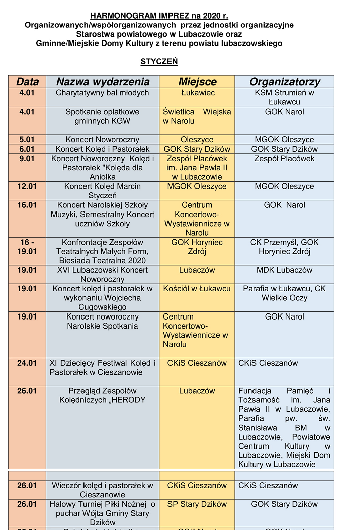 Wydział Promocji Starostwa Powiatowego w Lubaczowie opublikował kalendarz imprez kulturalnych w powiecie lubaczowskim w 2020 roku. Zobaczcie rozpiskę.