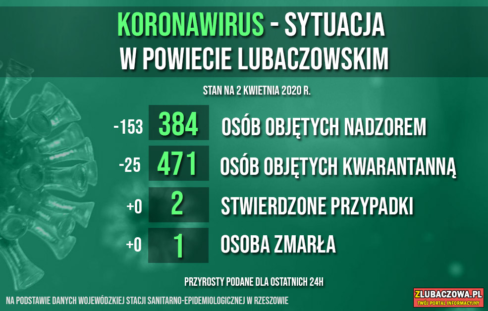 Według danych Wojewódzkiej Stacji Sanitarno-Epidemiologicznej w Rzeszowie na dzień dzisiejszy (02.04) 384 osoby objęte jest nadzorem epidemiologicznym (spadek o 153) natomiast 471 jest poddanych kwarantannie domowej (spadek o 25). Do tej pory stwierdzono 2 przypadki zakażenia - u młodej kobiety z gminy Stary Dzików oraz mężczyzny w średnim w wieku z gminy Wielkie Oczy. Niestety zakażona 32-letnia kobieta z gminy Stary Dzików zmarła w poniedziałek w szpitalu w Łańcucie.