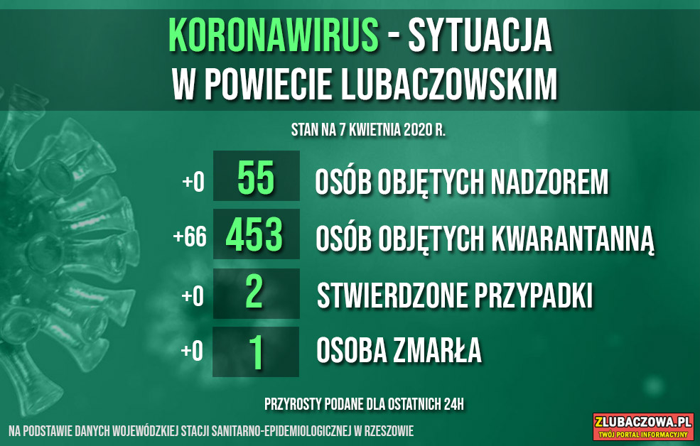 Według danych Wojewódzkiej Stacji Sanitarno-Epidemiologicznej w Rzeszowie na dzień dzisiejszy (07.04) 55 osób objętych jest nadzorem epidemiologicznym (bez zmian w stosunku do dnia wczorajszego) natomiast 453 jest poddanych kwarantannie domowej (wzrost o 66). Do tej pory stwierdzono 2 przypadki zakażenia - u młodej kobiety z gminy Stary Dzików oraz mężczyzny w średnim w wieku z gminy Wielkie Oczy. Niestety zakażona 32-letnia kobieta z gminy Stary Dzików zmarła w poniedziałek w szpitalu w Łańcucie.