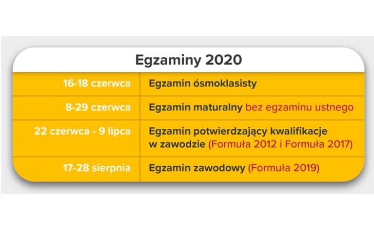 Z kolei część pisemna egzaminu maturalnego w terminie głównym dla absolwentów wszystkich typów szkół rozpocznie się w poniedziałek, 8 czerwca 2020 roku i potrwa do 29 czerwca. W tym roku nie będzie egzaminów ustnych.