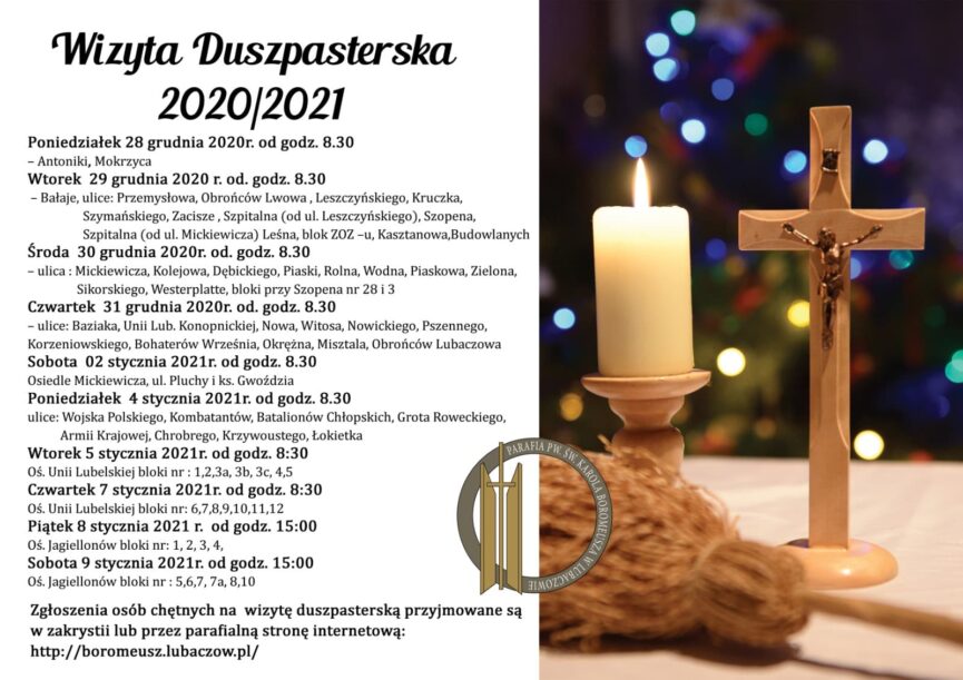 W tym roku wizyta duszpasterska w naszej parafii będzie wyglądała inaczej niż w ubiegłych latach. Nie będzie tradycyjnych odwiedzin rodzin. Kapłani będą zapraszać parafian z poszczególnych ulic i wiosek na Mszę Świętą i adorację Najświętszego Sakramentu do naszych świątyń. Wierni z kościoła zabiorą obrazki kolędowe oraz wodę poświęconą (pojemnik na wodę należy mieć swój).