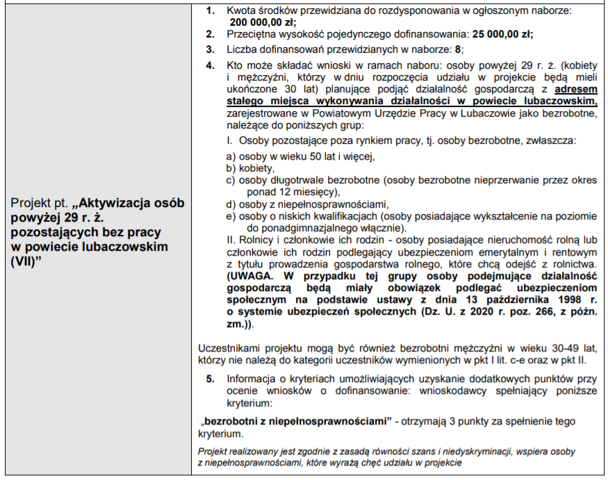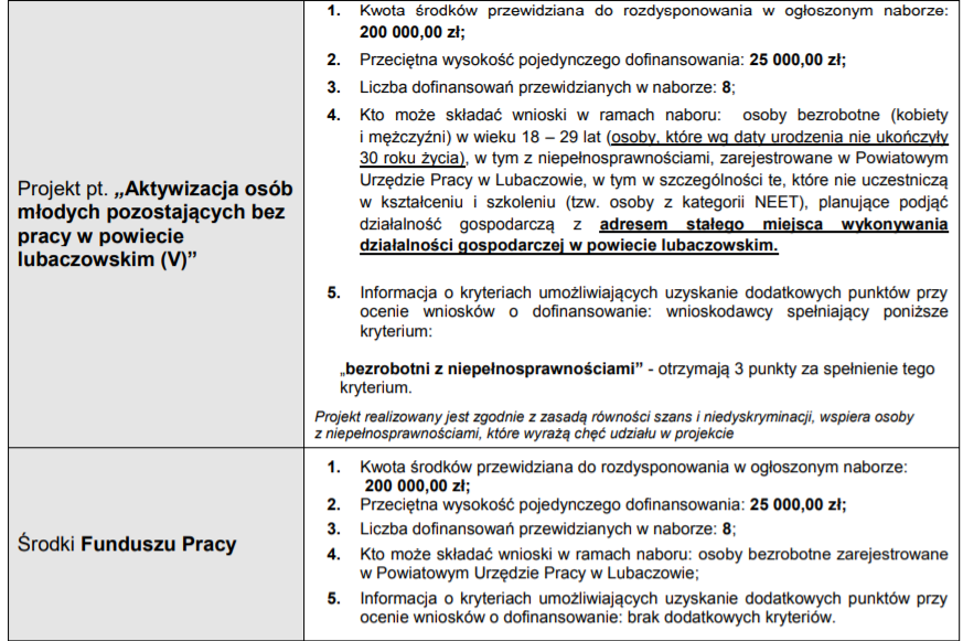Szczegółowe informacje dotyczące kwalifikowania wniosków o dofinansowanie do konkursu zawarte są w siedzibie Powiatowego Urzędu Pracy w Lubaczowie lub na stronie internetowej urzędu: http://lubaczow.praca.gov.pl