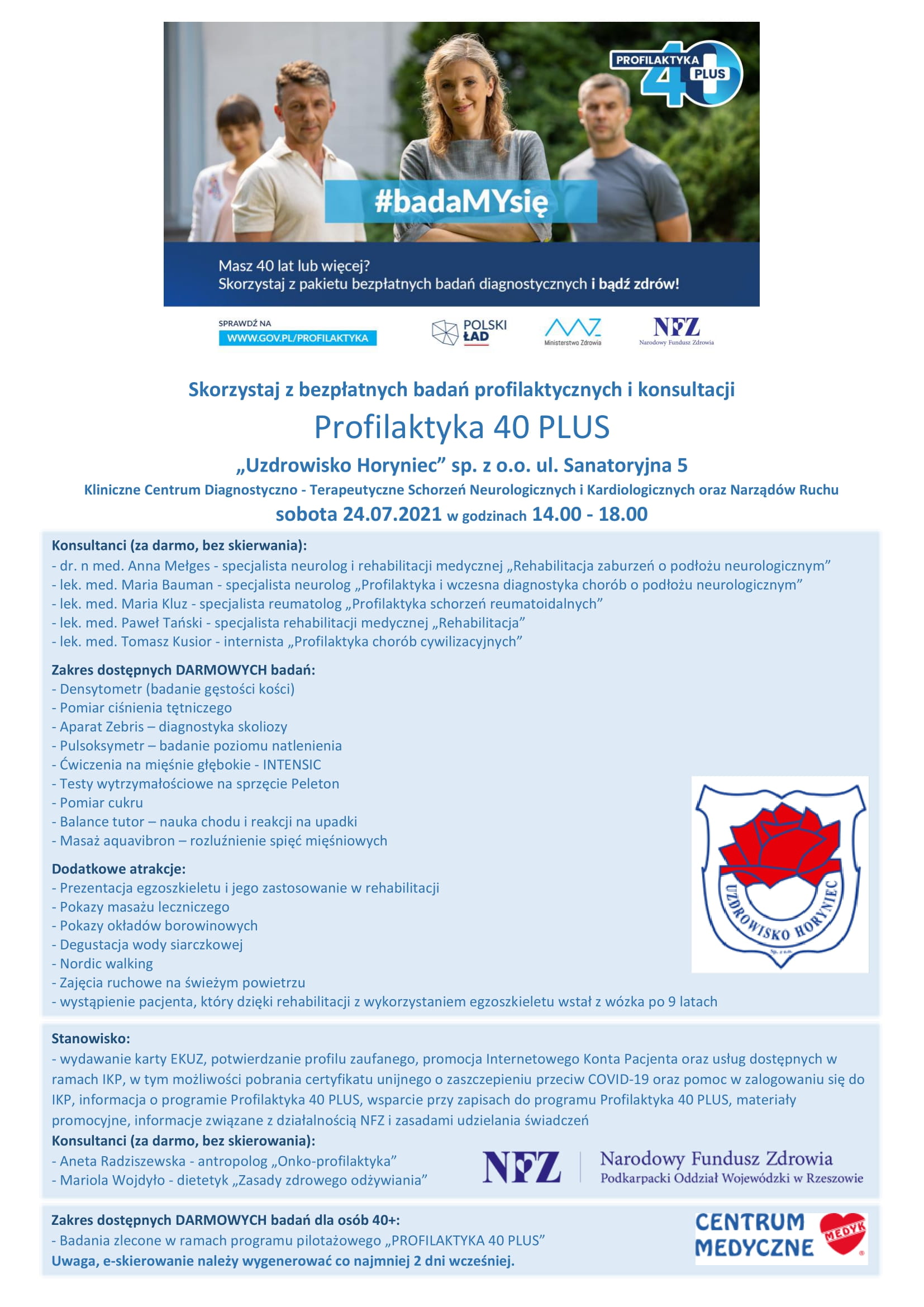 Uzdrowisko Horyniec oraz Podkarpacki Oddział Wojewódzki NFZ zaprasza osoby powyżej 40 roku życia na darmowe badania i konsultacje w ramach programu Profilaktyka 40 PLUS.