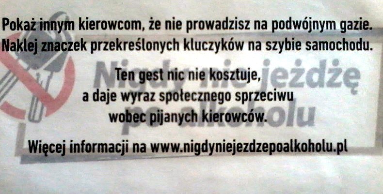 Podkarpaccy policjanci przyłączają się do kampanii. Podczas działań na drogach, takich jak np. "Alkohol i narkotyki" czy "Trzeźwy poranek" będą rozdawać kontrolowanym kierowcom specjalnie przygotowane naklejki ze znaczkiem przekreślonych kluczyków i hasłem "Nigdy nie jeżdżę po alkoholu". Umieszczone na tylnej szybie samochodu znaczki będą wyrazem społecznego sprzeciwu wobec pijanych kierowców.