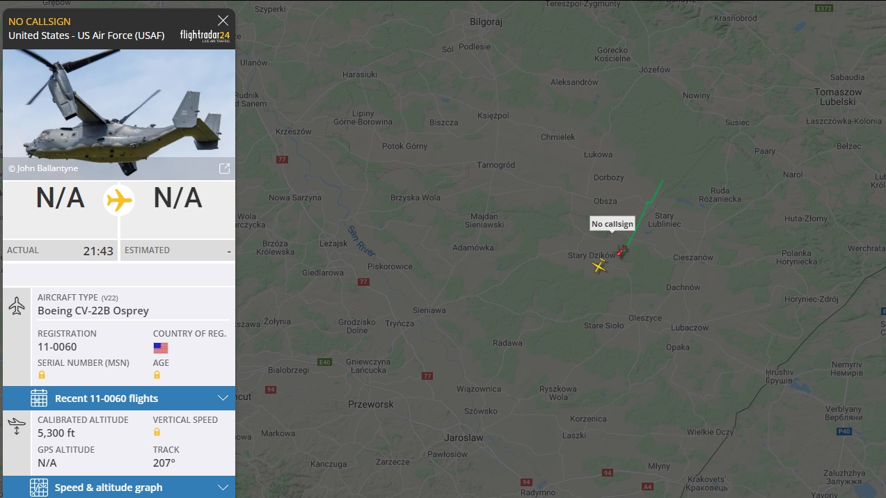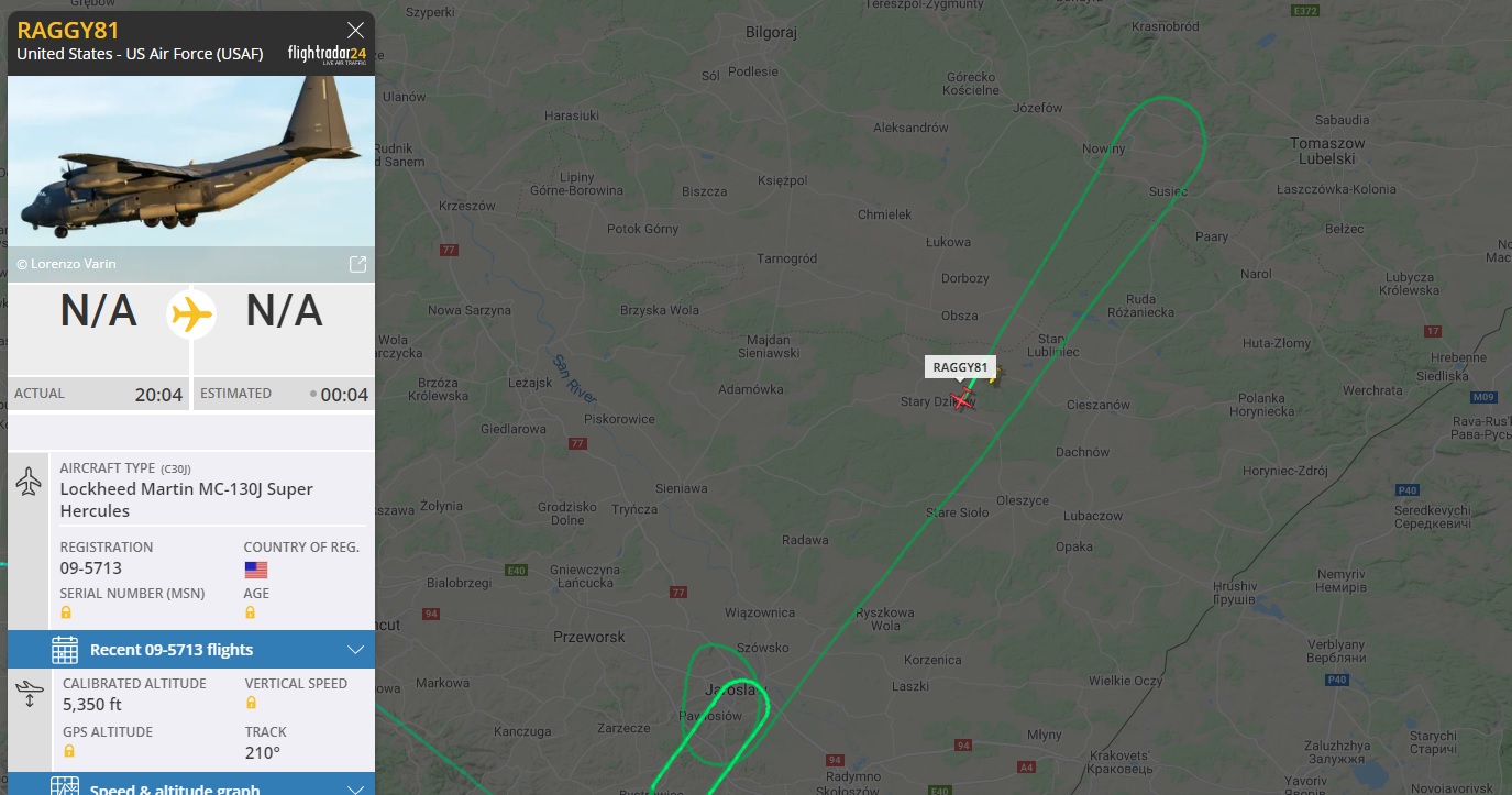 Natomiast w poniedziałek w nocy nad powiatem lubaczowskim pojawiły się dwie wojskowe maszyny Sił Powietrznych Stanów Zjednoczonych - Lockheed C-130 Hercules oraz Boeing CV-22B Osprey. Trasę przelotu możecie zobaczyć poniżej: