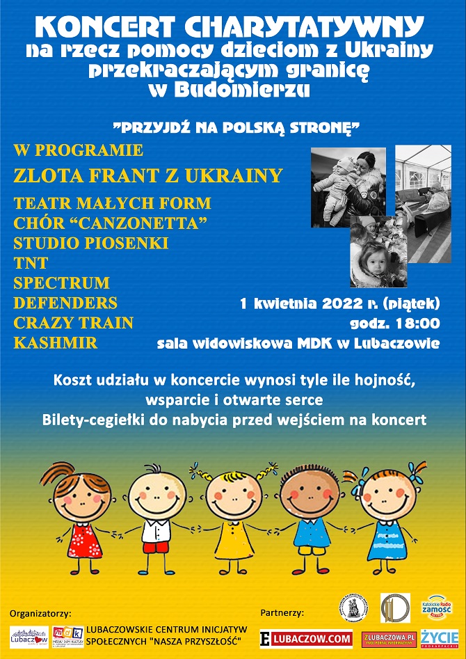 W piątek 1 kwietnia w Miejskim Domu Kultury w Lubaczowie odbędzie się koncert charytatywny na rzecz pomocy dzieciom z Ukrainy przekraczającym granicę w Budomierzu.