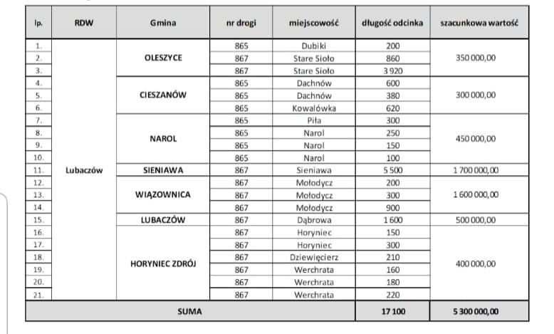 Dzięki tym pieniądzom zostaną naprawione najbardziej uszkodzone drogi wojewódzkie na odcinkach m.in. Oleszyce - Sieniawa, Dachnów - Narol, a także Horyniec-Zdrój - Hrebenne.
