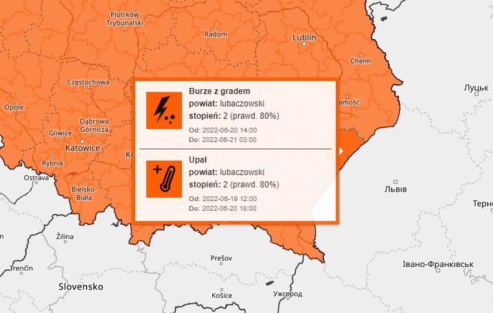 Instytut Meteorologii i Gospodarki Wodnej ostrzega, że na terenie powiatu lubaczowskiego mogą wystąpić burze z gradem. Wydano także ostrzeżenie dotyczące upału.