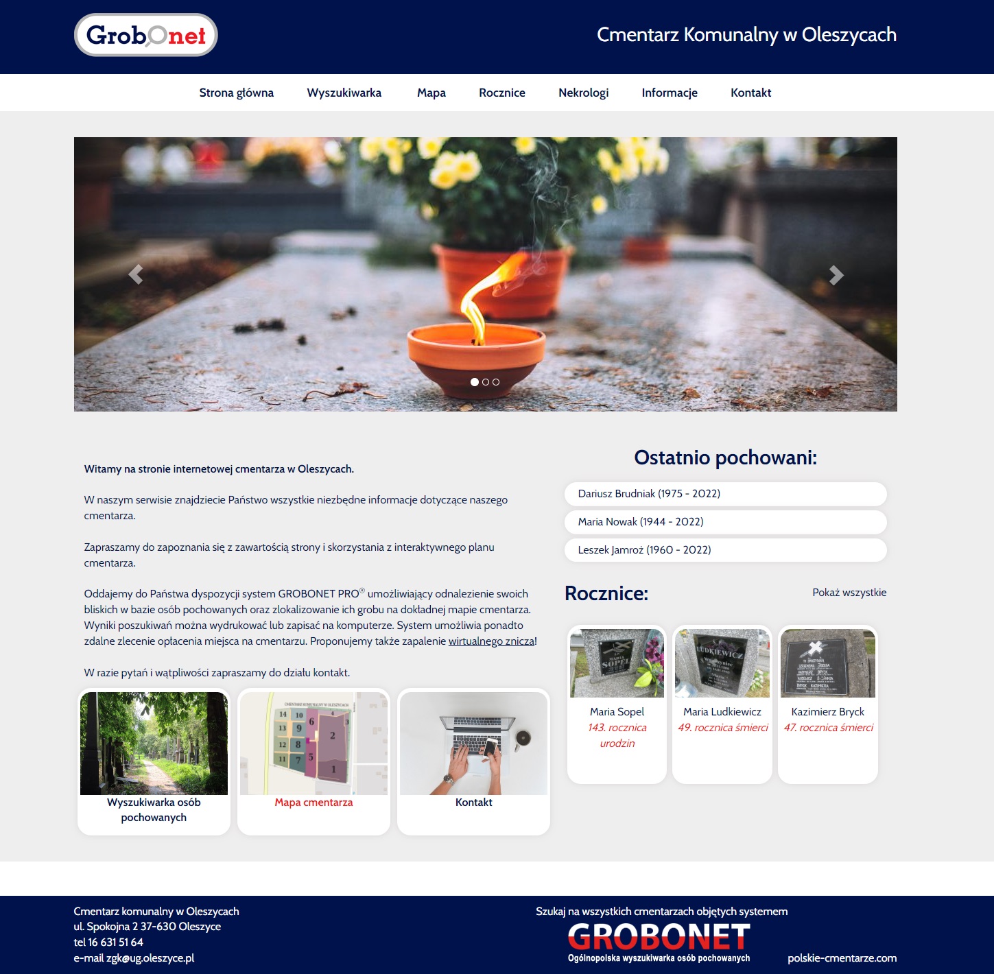 Zakład Gospodarki Komunalnej w Oleszycach uruchomił właśnie interaktywną wyszukiwarkę grobów na cmentarzu w Oleszycach Dzięki systemowi GROBONET możliwie jest odnalezienie swoich bliskich w bazie osób pochowanych oraz zlokalizowanie ich grobu na dokładnej mapie cmentarza. Wyniki poszukiwań można wydrukować lub zapisać na komputerze. System umożliwia ponadto zdalne zlecenie opłacenia miejsca na cmentarzu. Portal udostępnia także usługę „Zapal wirtualny znicz”. Wystarczy tylko umieścić swój podpis, np. podając swoje imię lub pisząc „Przyjaciel”.