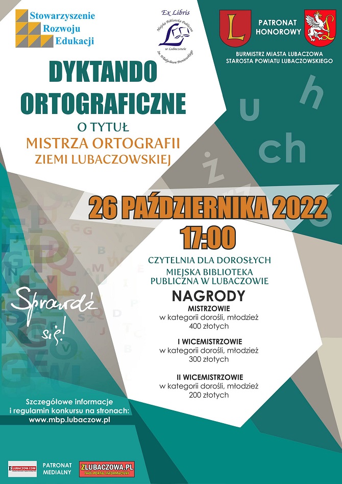 Każdego kto chce zawalczyć o tytuł Mistrza Ortografii Ziemi Lubaczowskiej 2022 i otrzymać atrakcyjne nagrody zapraszamy do wzięcia udziału w dyktandzie organizowanym przez naszą Bibliotekę oraz Stowarzyszenie Rozwoju Edukacji działające przy Liceum Ogólnokształcącym im. Tadeusza Kościuszki w Lubaczowie.